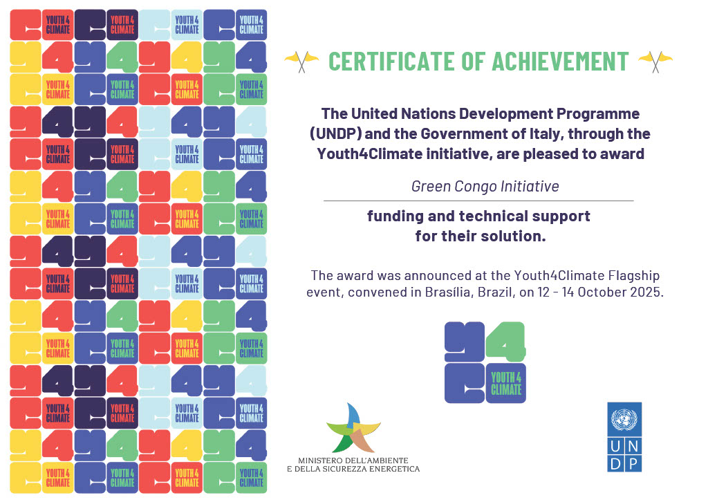 Green Congo Initiative est fière d’annoncer qu’elle a Ă©tĂ© laurĂ©ate du Prix Youth4Climate, dĂ©cernĂ© par le Programme des Nations Unies pour le DĂ©veloppement (PNUD) et le Gouvernement de l’Italie, lors de l’évĂ©nement Youth4Climate Flagship tenu Ă BrasĂlia, au BrĂ©sil, du 12 au 14 octobre 2025.